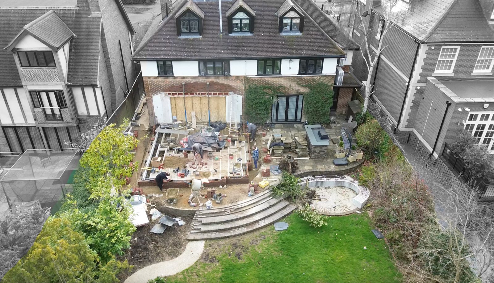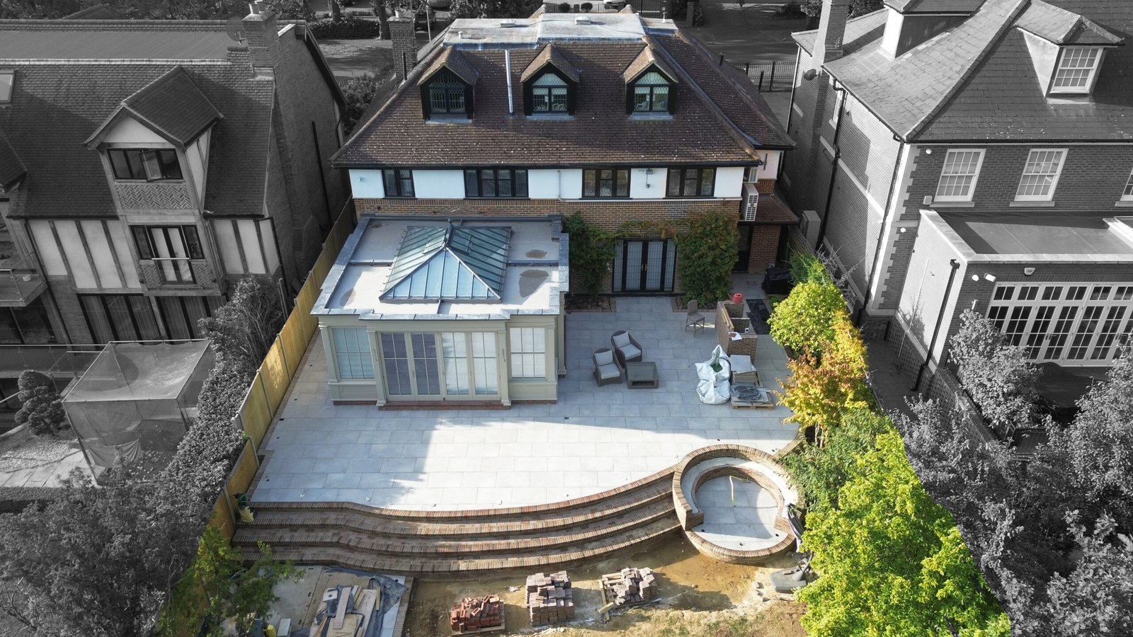 The second phase of the project involved the creation of both soft and hard landscaping by our experts, which included the main patio, terrace, a secluded lounge area, and a fire pit, enhancing this exquisite residence.
